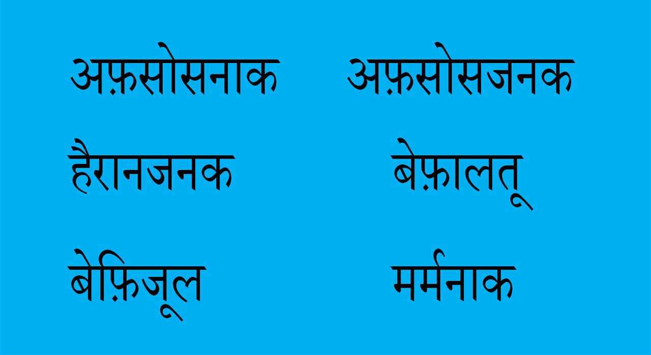 ‘खानापूरी’ और ‘पेशाबघर’ जैसे शब्द हम अकसर प्रयोग करते हैं। ‘खाना’ और ‘पेशाब’ फ़ारसी के हैं तो ‘पूरी’ और ‘घर’ हिन्दी के। इसी तरह ‘धन-दौलत’, ‘समझौता-परस्त’, ‘काम-धन्धा’, ‘गुलाब-जामुन’, ‘खेल-तमाशा’, ‘चोर-बाज़ार’, ‘दाना-पानी’, ‘बाल-बच्चे’, ‘तन-बदन’, ‘सीधा-सादा’ जैसे संयुक्त शब्दों में पूर्वार्ध हिन्दी है तो उत्तरार्ध फ़ारसी।